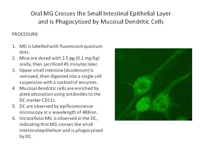 For oral MG (microparticulate glucan) to cause changes in the immune system, it must be absorbed across the epithelium of the small intestine. There are those who say that particulate b-glucan cannot be absorbed. Giving a dose equivalent to the MG Beta 1,3/1,6 glucan, 10 mg capsule, it was found that fluorescently labeled MG crosses the small intestinal epithelium and is phagocytized by mucosal dendritic cells (DC). In the mucosal associated immune system (MALT), the mucosal dendritic cell is the gatekeeper for almost all immune responses.